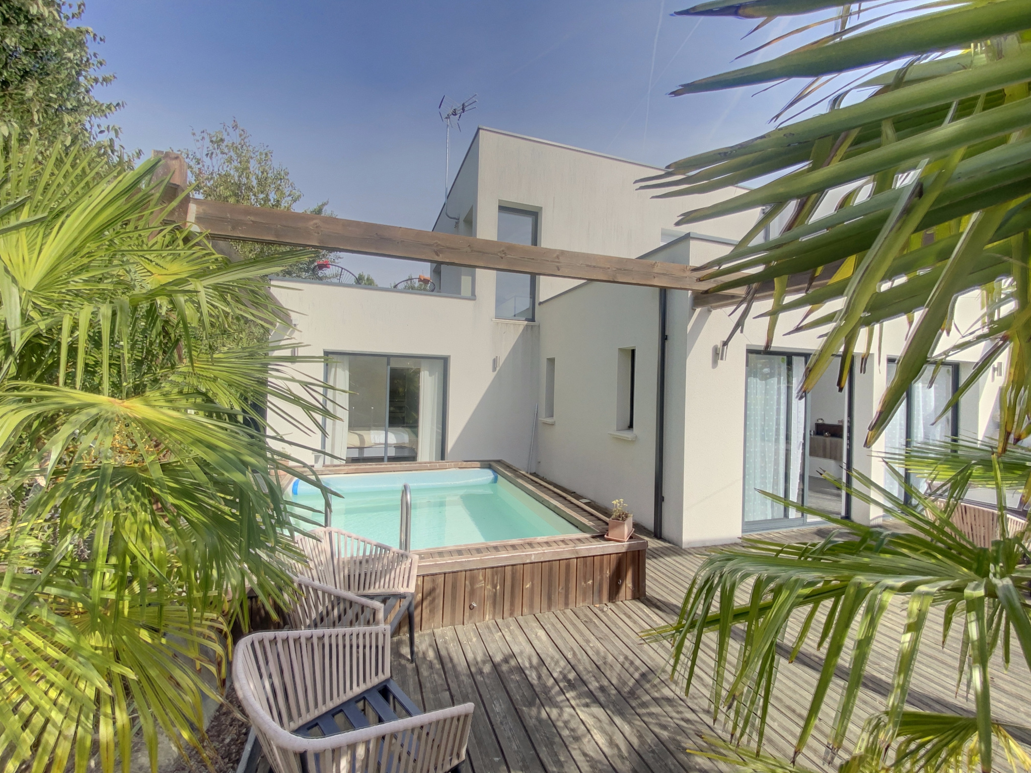 Une pièce de vie lumineuse aveec cuisine aménagée et équipée, une suite parentale de plain pied avec acces direct à la terrasse et la piscine. A l'étage, 2 chambres avec rangements muraux, une salle d'eau et une terrasse. Un garage de 25 m².