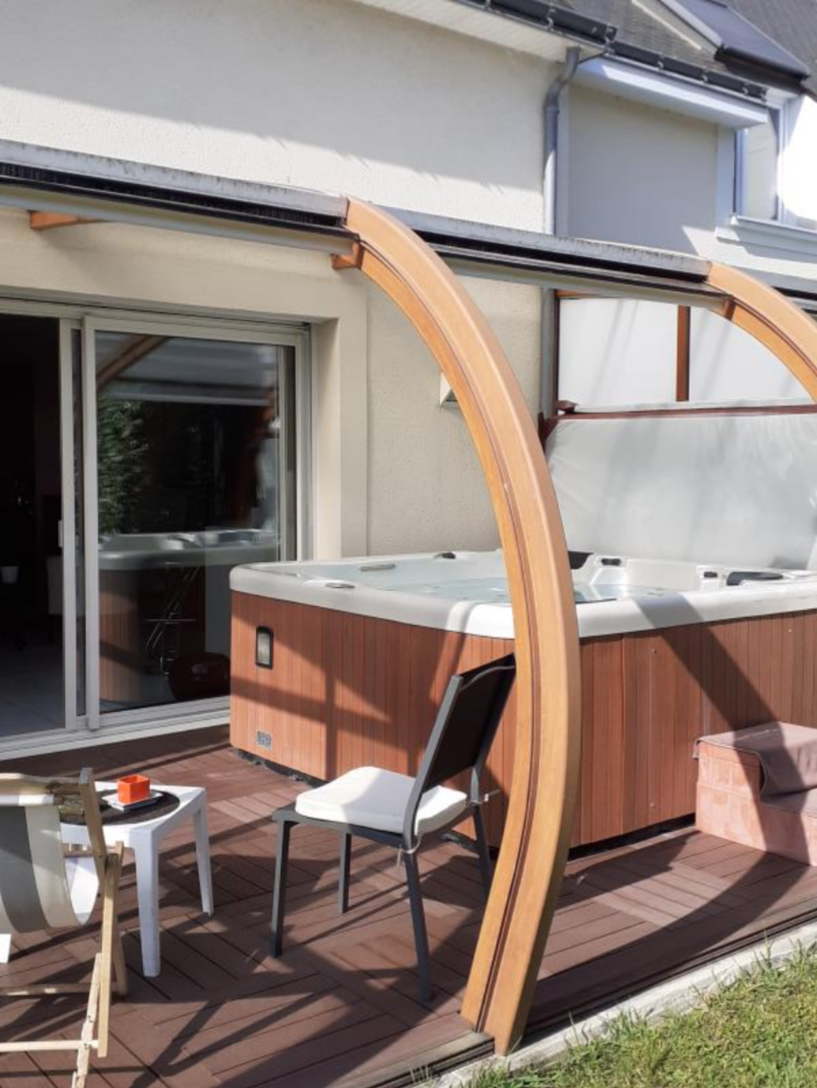 Au rez de chaussée, elle est composé d'une belle entrée avec un plafond cathédrale, un beau séjour avec cheminée ouvrant sur un spa, une cuisine moderne aménagée et équipée avec un cellier attenant. On y trouve également une chambre/bureau avec son dressing et un wc avec son point d'eau.